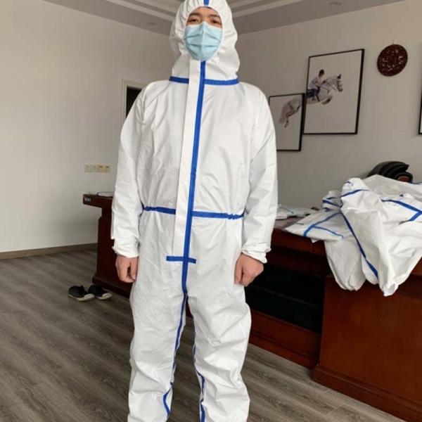 The product is a one-piece mchanism , which consist of a hooded jacket and pants, and there are elastic closing up designs on the cuffs and foot openings. The elastic closing design is applied in the hoodie face ans wasit. The main material is the polypropylene non-woven fabric with polypropylene film.The sealing rubber strip is made of rubber-lined non-woven fabric